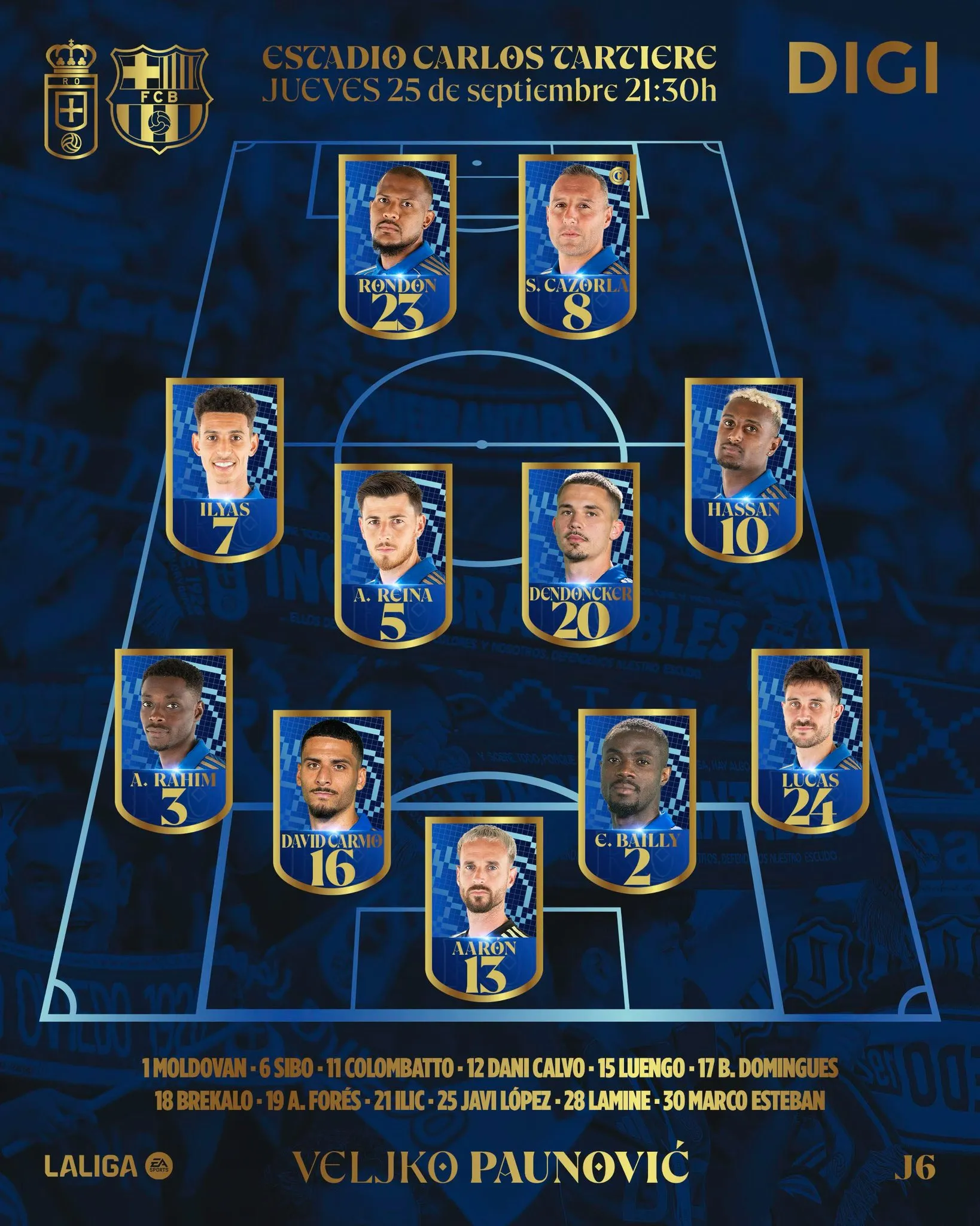 奥维耶多首发:13-埃斯坎德尔/24-卢卡斯-艾哈多、2-拜利、16-卡尔莫、3-阿拉萨内/10-哈桑、20-登东克尔、5-雷纳、7-伊莱亚斯-凯拉/8-卡索拉、23-隆东
