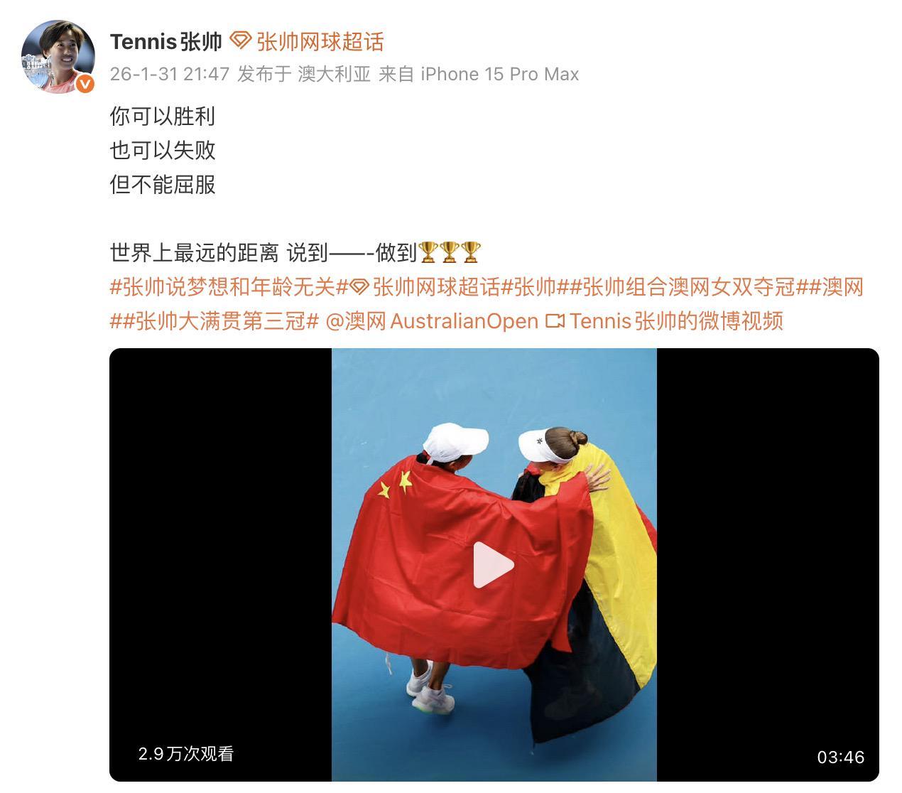 当张帅与搭档梅尔滕斯在罗德·拉沃尔球场紧紧相拥,庆祝2026年澳大利亚网球公开赛女双冠军的荣耀时刻,她不仅收获了职业生涯第三座大满贯双打奖杯,也完成了个人第五次大满贯女双决赛之旅。时光在墨尔本公园似乎有着独特的重量,它见证了太多中国网球的“第一次”,也承载了张帅个人二十载职业生涯中最深刻的淬炼与涅槃。